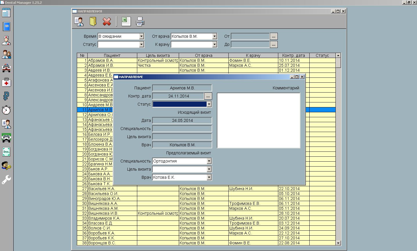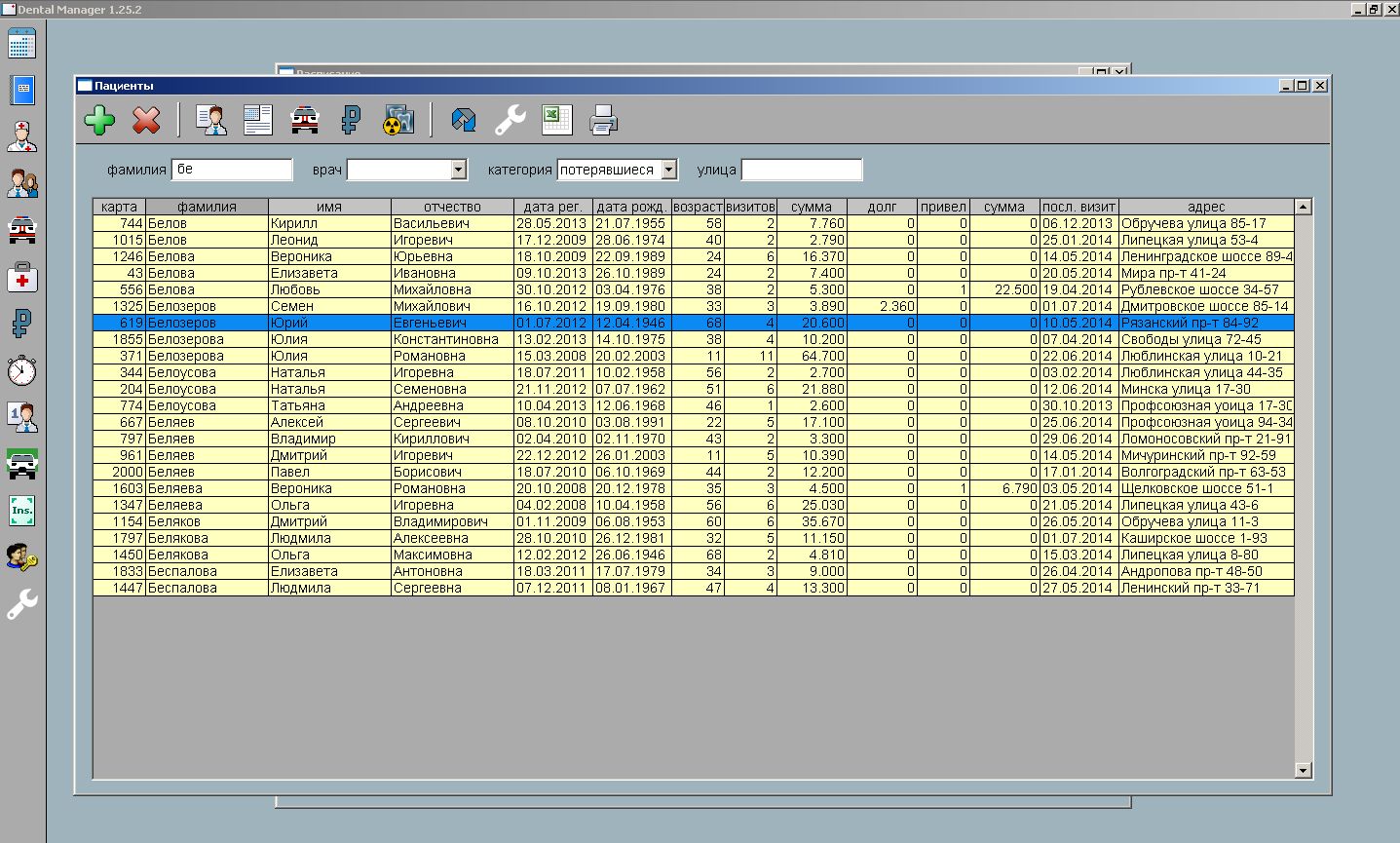 Возможно сформировать список именинников, должников, страховых и "потерявшихся" пациентов. Потерявшимися система считает пациентов, у которых нет визита или направления на лечение на будущее.