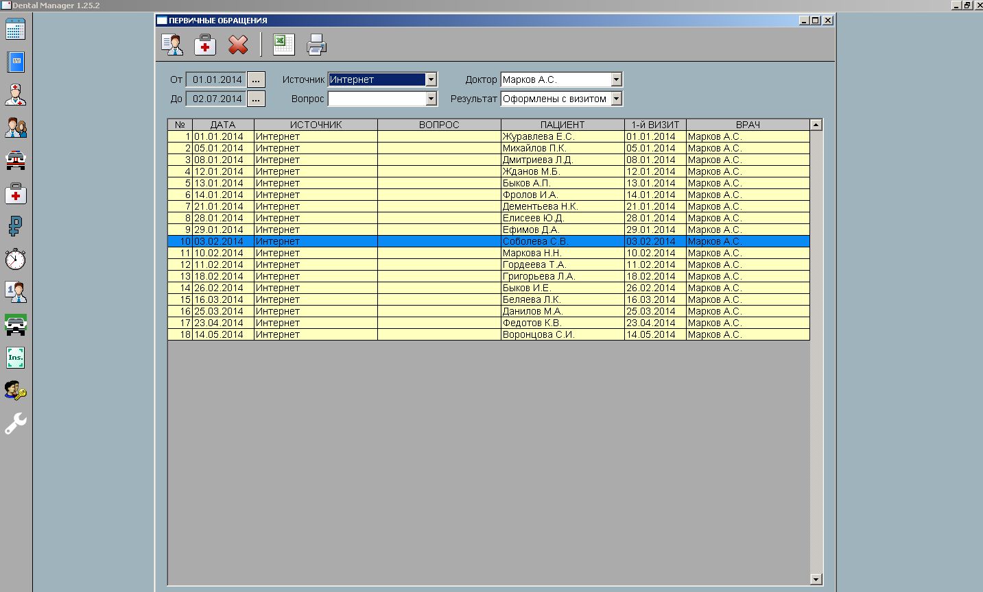 Все первичные обращения пациентов собираются в статистику с указанием источника информации. Система учитывает случаи, когда источником информации был другой пациент и сотрудник клиники.