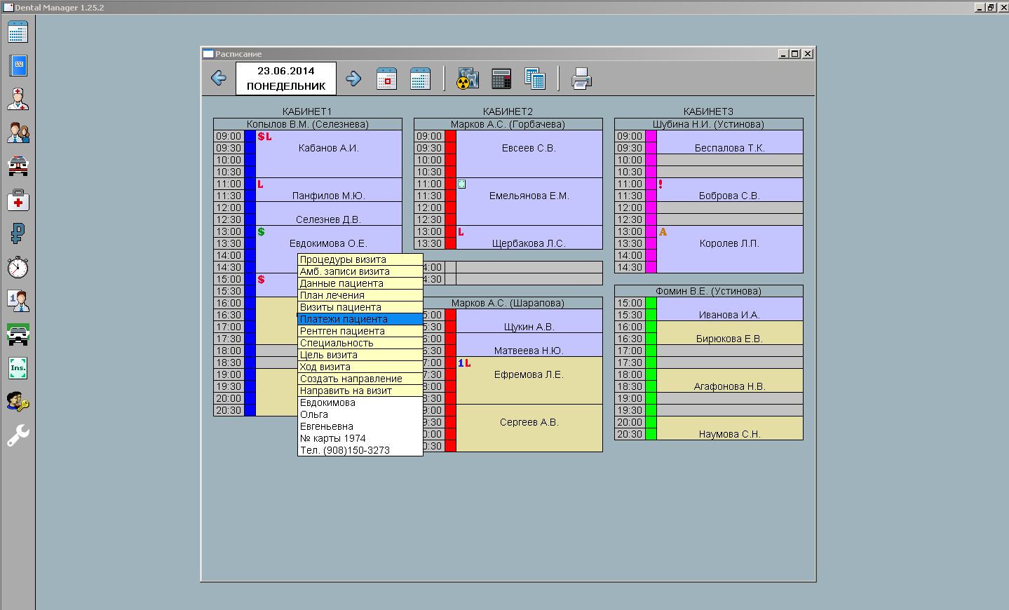 Расписание имеет удобное управление резервами рабочего времени врачей и визитами пациентов. Рабочее время выделяется закрепленным за врачом цветом. Статус хода визита помечается цветом, а цель визита аббревиатурой. Списки статусов и целей визита редактируются. В поле визита отображаются специальные символы, сигнализирующие о задолженности пациента, наличии авансовых платежей, страховке, аллергии, комментариях и другую полезную информацию. Через контекстное меню визита удобно управлять его статусами и переходить на любую часть карты пациента. Есть возможность введения нестандартных интервалов.