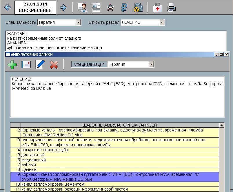 Амбулаторную карту можно редактировать и в общем поле и по разделам. Шаблоны амбулаторных записей делятся по специализации врача и по разделу карты.